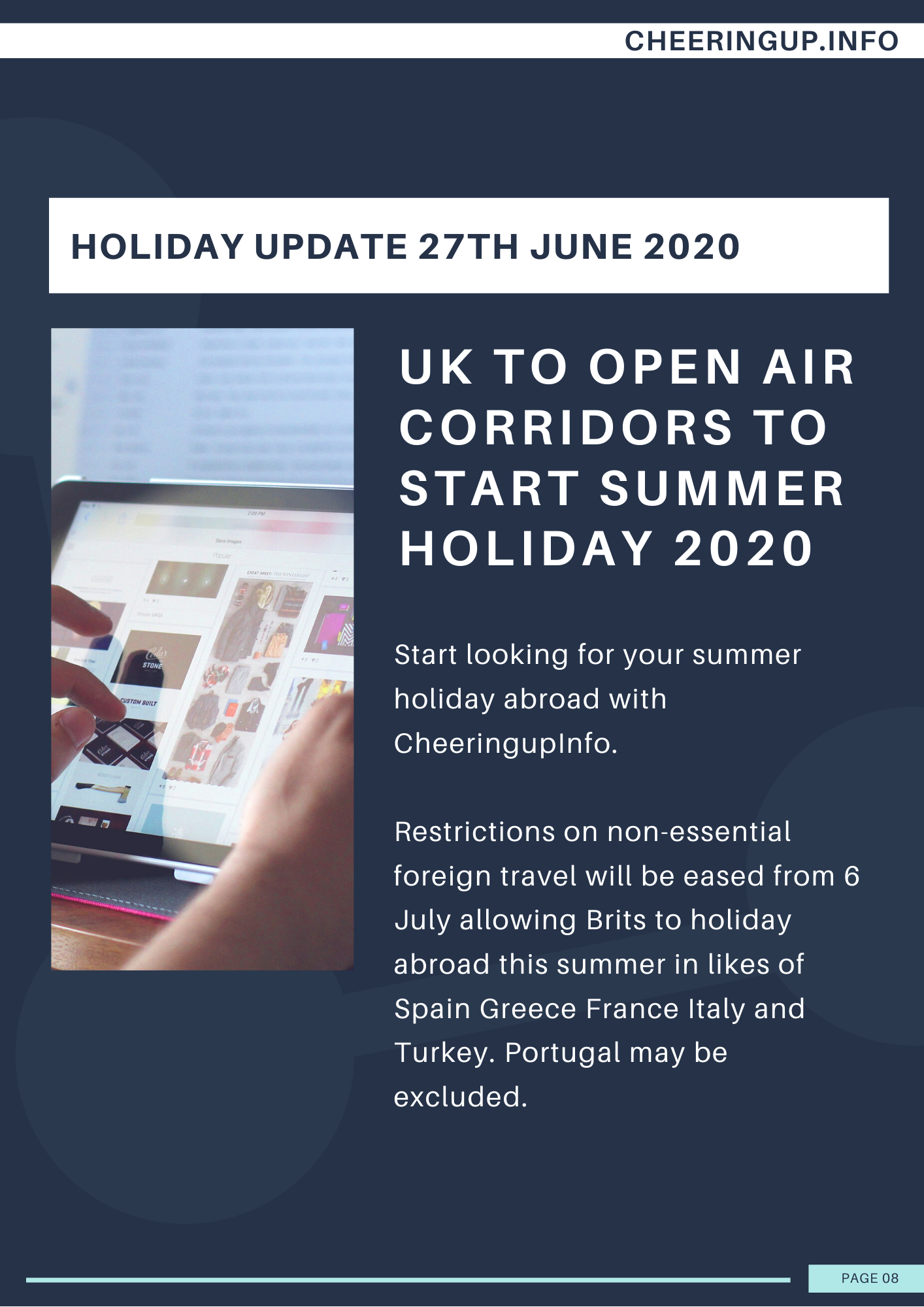 Start looking for your summer holiday abroad with CheeringupInfo. UK travel corridors to open up from UK to many destinations around the world opening up an opportunity for cheap summer holiday abroad this summer. People returning from foreign holiday to chosen countries will not need to self quarantine when they return from their holiday abroad. Foreign holidays will reopen to Brits this summer. UK travel companies report their biggest Saturday sales ever as holiday bargain hunters in UK want to save money on their next holiday abroad. Find out where you can go on holiday for the best holiday deals with CheeringupInfo.